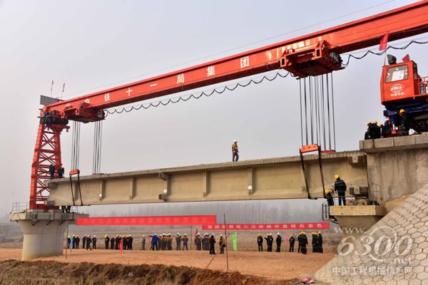 1月18日,中铁十一局职工在湖北省天门市境内安装江汉平原货运铁路一期工程姚家河大桥第一片桥梁。新华社记者 杜华举 摄
