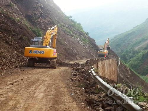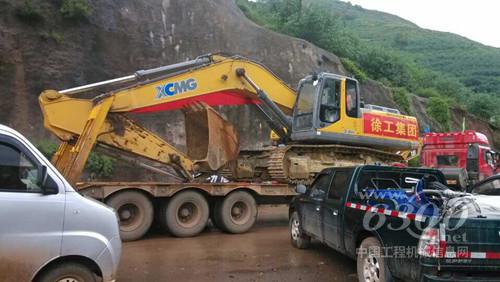徐工援助灾区的挖掘机在鲁甸疏通塌方道路