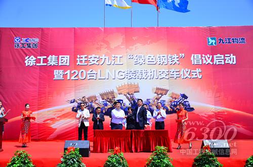 5月20日,近期LNG装载机热点事件——工程机械行业盛传已久的“全球第一单”120台徐工第三代LNG装载机交车仪式,在河北迁安九江物流基地震撼举行。“徐工集团——迁安九江‘绿色钢铁’倡议活动”同时启动。来自河北唐山、秦皇岛地区的各大钢铁企业用户,以及港口、水泥煤炭等行业的领导型客户200余人共襄盛举。徐工机械副总裁、徐工铲运机械事业部总经理杨东升和迁安九江物流常务副总经理王良,代表双方企业交接车辆,并联合发出“绿色钢铁”倡议。