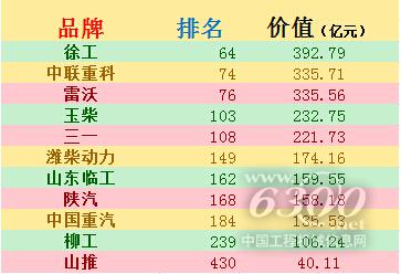 在本次发布的榜单中,以徐工为代表的多家工程机械企业均榜上有名,徐工更是以392.79亿元的品牌价值再次领跑工程机械板块,较2014年提升了105.43亿元,在500强中位列第64位,彰显了其突出的产品质量和企业实力以及超高的品牌信任度。