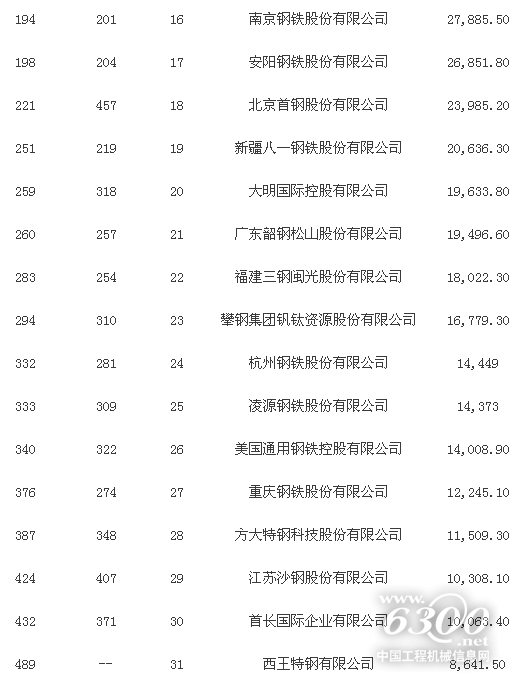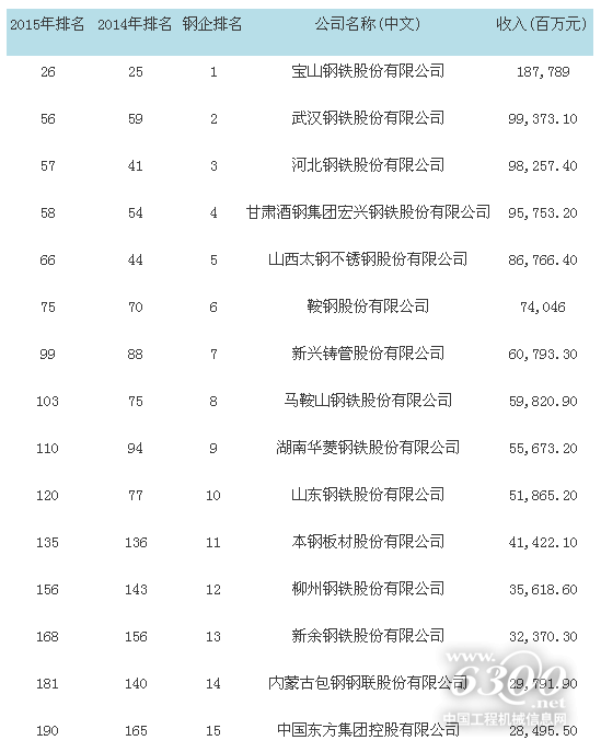 7月8日,财富中文网发布2015年中国500强企业名单,本排行榜覆盖范围包括在中国境内外上市的所有中国公司,所依据数据为上市公司在各证券交易所正式披露信息。其中宝山钢铁股份有限公司以2014年营业收入1877.89亿元位列第26名,也是唯一入围财富中国500强前50强的钢企,紧随其后为武汉钢铁股份有限公司和河北钢铁股份有限公司,分别位列56和57名。