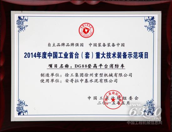 日前,以“中国制造2025迈向强国之路”为主题的第十一届中国工业论坛在北京召开,会上隆重发布了“2014年度中国工业重大技术装备首台(套)示范项目暨功勋用户”,徐工起重机械事业部研制的DG88超高米数登高平台消防车入选“2014年度中国工业首台(套)重大技术装备示范项目”,其使用单位安哥拉中基水泥有限公司荣获“中国工业首台(套)重大技术装备功勋用户”。