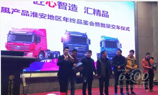 在随后的交车仪式上,胡主任及淮安新飞杨汽车销售有限公司总经理赵春国先生向用户交付15台漢風重卡的金钥匙。