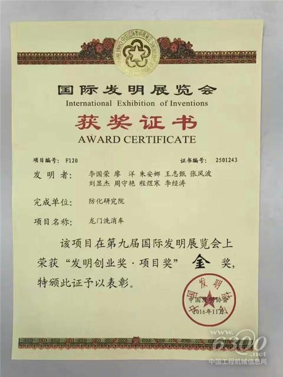 2016年11月17日,昆山国际会展中心召开第九届国际发明展览会,徐工随车与陆军装备部合作的项目——龙门洗消车获得“国际发明创业奖金奖”。