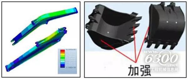 (1)通过CAE技术,模拟动臂斗杆最大受力工况,对其应力集中区域进行结构分析,并进一步优化结构,保证其高可靠性;