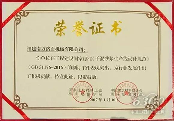 2017年1月10日,在2017'首届中国国际预拌砂浆装备技术研讨会暨预拌砂浆绿色生产装备及机械化施工技术峰会上,福建南方路面机械有限公司被中国建材联合会预拌砂浆分会授予“中国预拌砂浆行业装备制造培训基地”;同时,因在国家标准GB51176-2016《干混砂浆生产线设计规范》编制工作中的特殊贡献,被授予“特别贡献单位”。