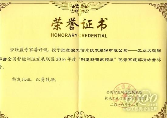 此次大会颁发了“智能工厂领域”“智能供应链领域”“智能服务领域”、“制造新模式领域”四项大奖,江苏徐工信息技术股份有限公司在凭借“工业大数据平台”在智能制造领域的突出业绩及表现, 成功斩获“制造新模式领域”优秀系统解决方案大奖。