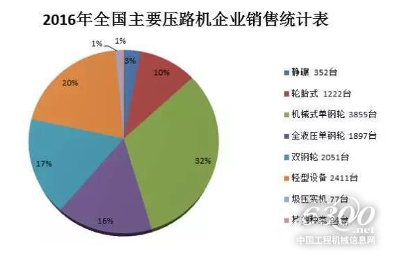 根据中国工程机械工业协会路面与压实机械分会统计,2016年全年参加统计的23家主要企业共销售压路机11959台,同比2015年的10388台增长15%。包括:静碾352台,轮胎式1222台,机械式单钢轮3855台,全液压单钢轮1897台,双钢轮2051台,轻型设备2411台,垃圾压实机77台,其他种类94台。