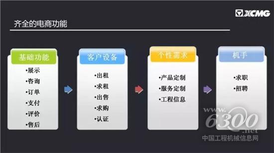以客户为中心,以电子商务平台为沟通手段,将供应商、制造商、渠道商以及最终客户贯穿起来,电商平台与内部业务系统数据打通,构建一个统一、绿色、共享、数字化的电子商务生态圈,为客户、供应商以及渠道商直接提供优质的增值服务,为产品的定制化服务创造基础,成就徐工创新价值。