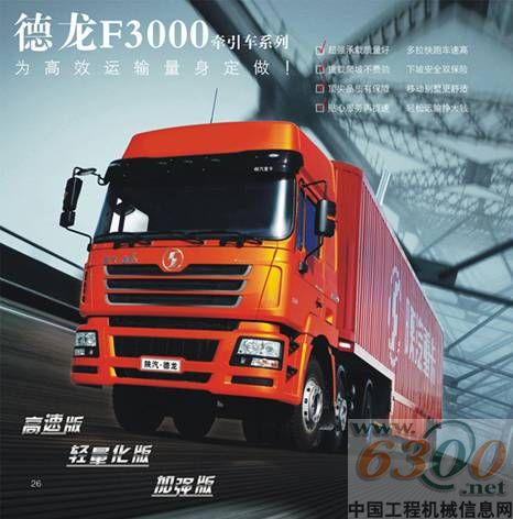 陕汽2010年全新亮相的“超值版”系列产品,突出体现了超舒适、超智能、超节省、超安心的“四超”价值优势,这些新优势即是陕汽联合潍柴动力、德国MAN、BOSCH、奥地利AVL、美国VISTEON、法士特、汉德等国际国内顶级研发团队,又结合中国实际国情链合创新的顶级产品。德龙F3000重卡作为陕汽主打精品的实力派车型,是目前国内唯一纯正的MAN技术产品,凭借多项领先尖端睿智的技术,独特尊贵的典雅气质、无与伦比的安全性能、超越同侪的卓越动力成为市场追逐的焦点。