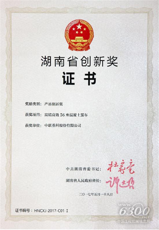 据悉,此次奖励首次增设了由省委、省政府共同表彰奖励的奖项——湖南省创新奖,该奖涵盖“科技创新奖”“产品创新奖”“文化创新奖”“管理创新奖”等四大类别,每类奖励不超过10个项目。而在湖南省政府网站公布的“湖南省首届创新奖评奖标准及拟表彰对象名单”中,由中联重科股份有限公司研发的“高精高效56米混凝土泵车”名列“产品创新奖”名单首位,当日下午,中联重科监事刘权、中联重科混凝土泵送研究所所长吴德志等参会并领奖。“这是我们研发团队奋战的结晶!”获奖之际,吴德志感慨万千。
