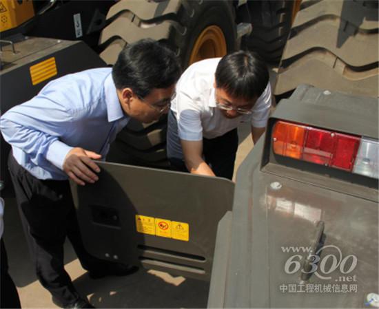 山东临工总经理文德刚(左)和装载机研究所所长王永参观产品