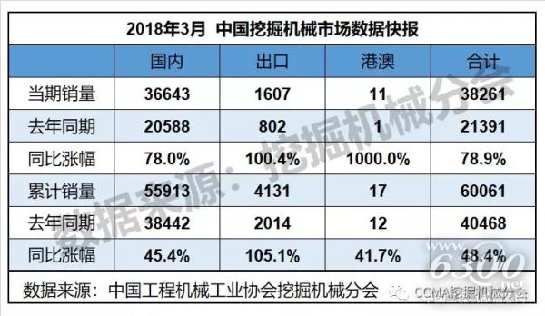 2018年3月,共计销售各类挖掘机械产品38261台,同比涨幅78.9%。国内市场销量(统计范畴不含港澳台)36643台,同比涨幅78.0%。出口销量1607台,同比涨幅100.4%。