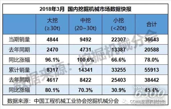 根据中国工程机械工业协会挖掘机械分会行业统计数据,2018年1—3月纳入统计的25家主机制造企业,共计销售各类挖掘机械产品60061台,同比涨幅48.4%。国内市场销量(统计范畴不含港澳台)55913台,同比涨幅45.4%。出口销量4131台,同比涨幅105.1%。