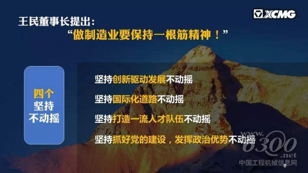 杨总重点分享了徐工多年来一直坚守的“四个坚持不动摇”的“一根筋精神”。他讲到,一个品牌的核心就是技术与品质,做强世界一流品牌的关键是技术领先、品质可靠。