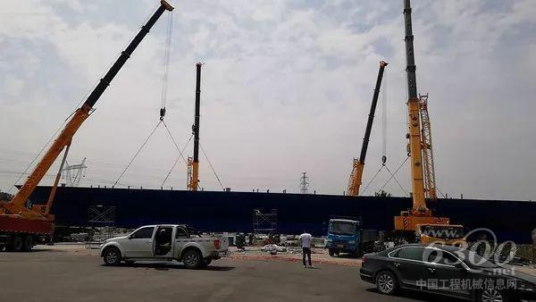 在七环建设线路中的一个出口建设工地上,4台徐工XCT90正在合力起吊一个重达116吨,跨度70米的钢箱梁。目前钢结构桥梁的广泛应用为城市交通的快速发展提供了有效的解决方案,钢箱梁的吊装都是采用单台或多台起重机抬吊进行作业的。徐工起重机作为业内首选品牌自然是当仁不让的工程主力,安全、高效、便捷、强劲让众多施工方的吊装方案变成了单项选择题。