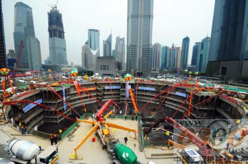 毗邻的上海环球金融中心混凝土工程总方量为23万多方,而上海中心一次性底板浇注量就相当于泵送了四分之一个“环球”。
