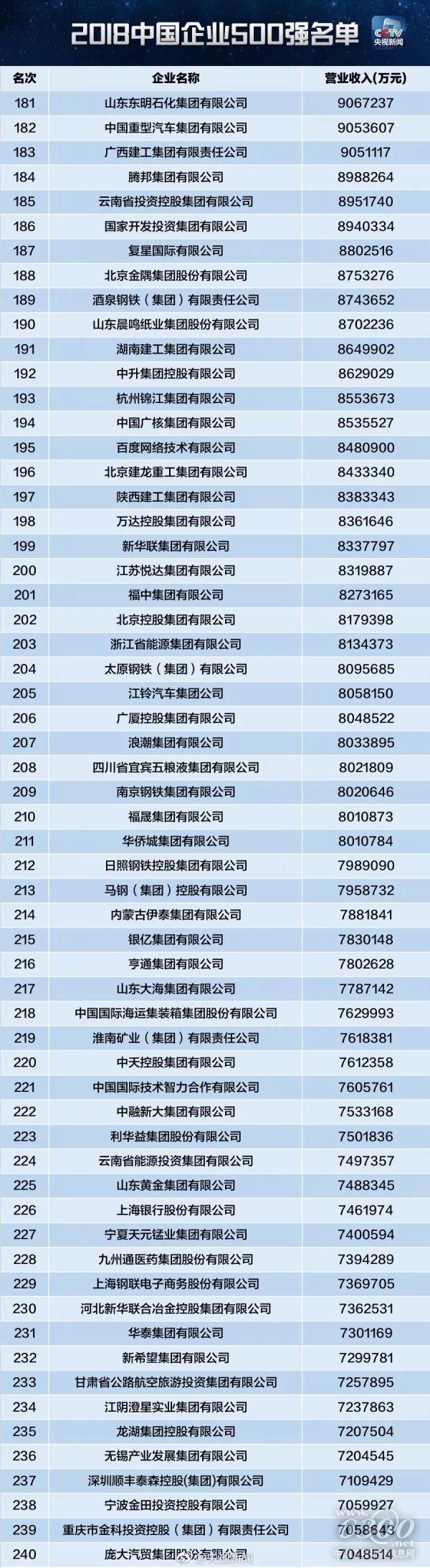 中国企业联合会发布的《中国500强企业发展报告(2018)》显示,制造业大企业表现总体好于服务业大企业。2018中国企业500强中有253家制造企业入围,比上年增加8家;制造企业营业收入、净利润、资产、净资产、纳税额、员工数等6个指标在全部500强中的占比均有不同程度提高。