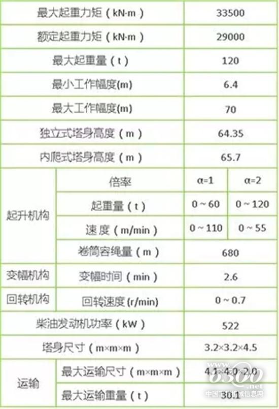 中联重科LH3350-120是目前我国吨位最大的动臂塔机,也是目前全球吨位最大的内爬式动臂塔机。其最大起重力矩为33500千牛米,最大吊重能力为120吨,相当于同时吊起17头成年大象。