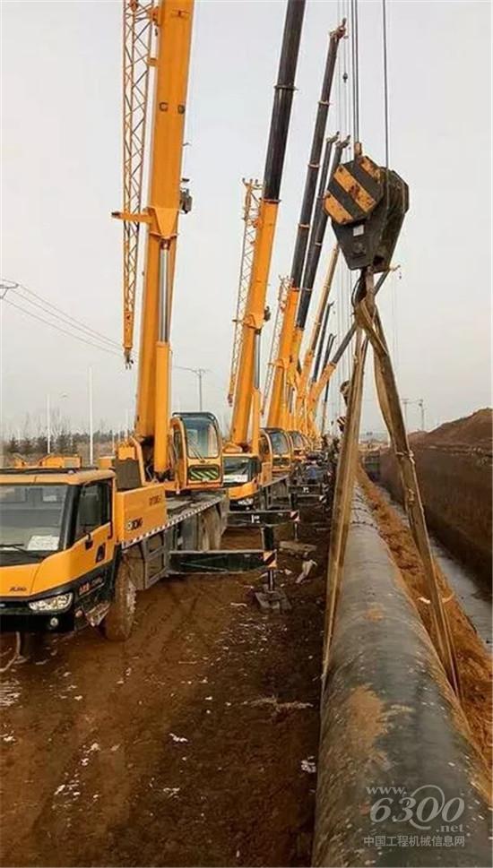140米长的管道,10余台徐工25吨起重机群集合力,每台车吊装4.5吨左右,伸出20多米大臂,半径13米,助力沈阳浑南区燃气管道工程建设。
