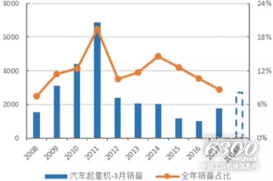 回顾历年一季度汽车起重机销售数据(2018年汽车起重机行业销量7278台)