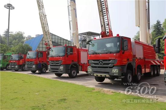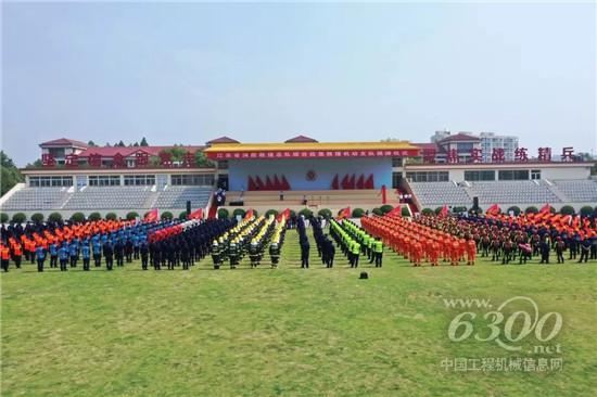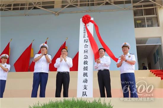 仪式现场,徐工XCA300全地面起重机、QY75K汽车起重机、DG54K1登高平台消防车、JP62S1举高喷射消防车、JP72S3举高喷射消防车、YT60云梯消防车、XE215DA履带式挖掘机整齐列阵,参与见证综合应急救援机动支队的成立。
