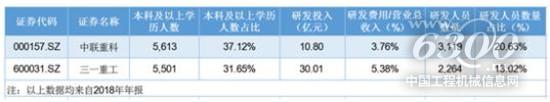 从研发团队规模来看,中联重科2018年研发人员共计3119人,同比增长16.73%,占总员工人数的20.63%;三一重工2018年研发人员共计2264人,同比增长25.12%,占总员工人数的13.02%。