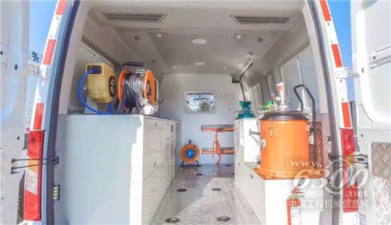 据介绍,中联重科服务保障车配备大空间工作舱,堪称一个“小型维修站”。后部工作舱配备专业抢修设备,包括电焊机、气动黄油加注机、齿轮油加注器、冷媒回收加注机及扳手等设备。