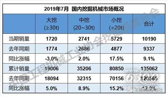根据中国工程机械工业协会行业统计数据,2019年1—7月纳入统计的25家主机制造企业,共计销售各类挖掘机械产品149553台,同比涨幅13.9%。国内市场销量135062台,同比涨幅12.0%。出口销量14491台,同比涨幅35.7%。2019年7月,共计销售各类挖掘机械产品12346台,同比涨幅11.0%。国内市场销量10190台,同比涨幅9.1%。出口销量2156台,同比涨幅20.7%。