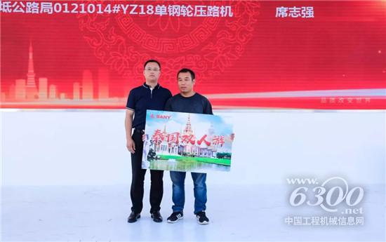 随后,李盈杰先生在现场揭晓了三一路机功勋设备评选结果,共有来自全国各地的31位三一路机优质客户获奖。特别值得一提的是,来自天津的客户席志强先生更凭借购置的三一单钢轮压路机在现场将特等奖泰国双人游抱回家,三一路机营销公司总经理肖正文先生上台为其颁发大奖并对其长期以来对于三一的支持表示感谢。
