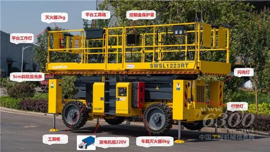 SWSL1223RT最大载重1200kg,最大行驶速度10 km/h,最大工作高度12m,最大爬坡能力40%,工作最大允许角度8°/10°。
