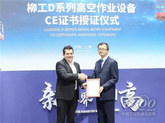 在D系列高空作业设备产品发布会上,TUV SUD 大中华区工业服务部总监Mr. Simon Lemin向安徽柳工高空作业设备分公司总经理刘国强颁发CE认证,标示着安徽柳工高空作业设备获得了欧盟公告机构的认可,为柳工高空作业设备进入欧洲市场迈出坚实的一步,柳工也将借此更好地服务全球高空客户。