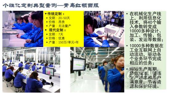 第四次工业革命是不是必须要一步步走呢?这是青岛红领,大家看到的都是人工在那儿操作,只有一部机器,缝纫机是电动的,它是第一次工业革命的水平,但是它通过了信息化的手段把40多个参数变成一万多个参数,这一万多个参数在工业互联网上自由流动,这一流就变成个性化定制,时间缩短了,成本减少了,产量上去了,这时候别人也没法跟他竞争,也就是说第一次工业革命的水平一步就跳到了第四次工业革命,这里面可能很多人不同意,它不叫智能制造,各有各的观点。