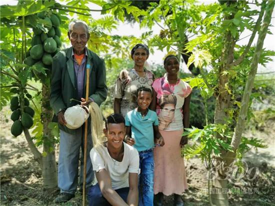 阿贝巴叶胡一家在结满果实的木瓜树前合影