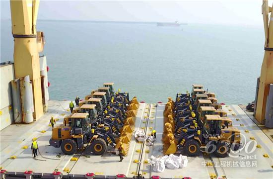 装载机、挖掘机、矿用自卸车等,随着吊装作业的开始,一台台徐工“重器”被依次装载至大型远洋巨轮上,整个装货时间仅用时43个小时。