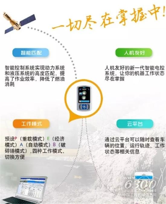 智能控制系统实现动力系统和液压系统的最佳匹配,提高了作业效率,降低了燃油消耗;人机友好的新一代智能电控系统,让你的机器工作状态尽在掌握;预设多种工作模式,切换方便;通过云平台可以随时查看车辆位置、运行轨迹、工作状态等相关信息。