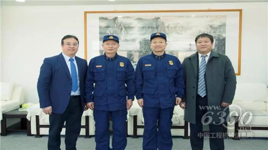 甘肃省消防救援总队长吴振坤、甘肃省消防救援总队政治委员蔡建波、三一集团副总裁谢志霞、甘肃泓畅工程机械有限公司董事长蓝廷合影