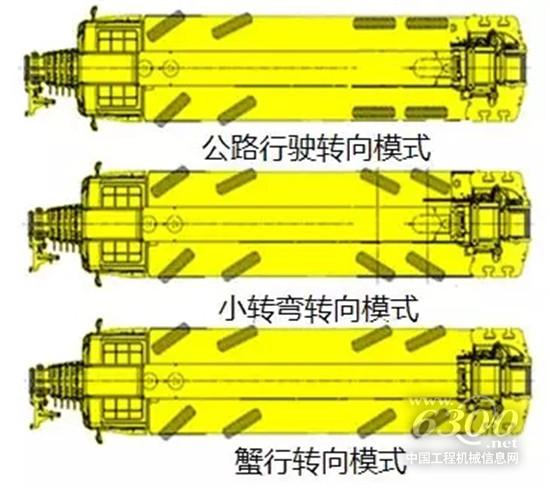 受场地限制,长期在狭窄作业环境施工时,可以选择全轮转向车型。独创缸控多模式随动转向系统,四桥转向,最小转弯直径20m,比行业同吨级产品小4m。可实现后轮锁止、全轮转向、蟹行三种转向模式,保证整车高速行驶稳定可靠,低速行驶机动灵活。避免铰点间隙及拉杆变形累积导致的转角误差,降低燃油消耗及轮胎磨损,节能高效,双管齐下。长期在坑洼地面施工时,可以选择双前桥转向,后桥双胎配置车型。接地面积更大,带载行驶能力更强,效率更高,通过性更强,轮胎不易陷入。