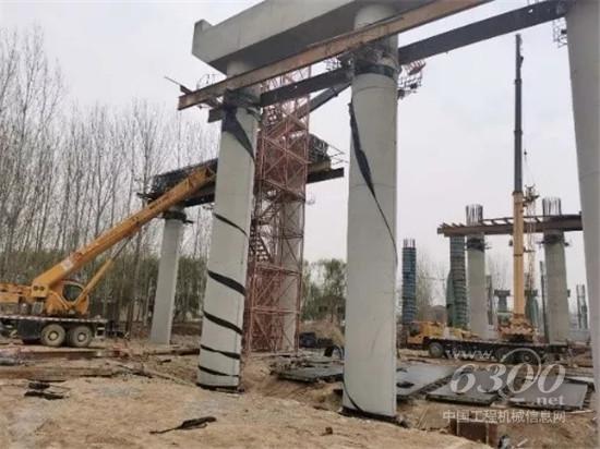 在山东省济宁市梁山县范台梁高速,6台K系列25吨齐心协力进行桥梁桩基及桥板吊装。