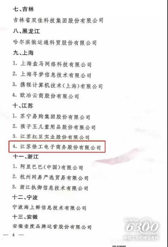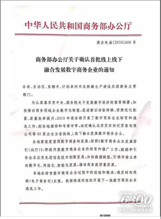 近日,国家商务部公布了全国首批线上线下融合发展数字商务企业名单,助力加快推动商务领域企业数字化转型,江苏徐工电子商务股份有限公司与阿里巴巴、京东、小米、苏宁等60家企业一道入选首批线上线下融合发展数字商务企业。