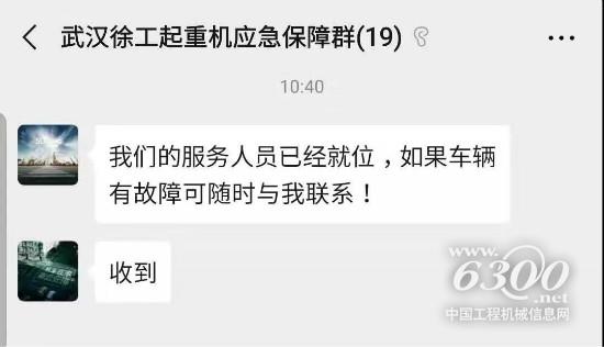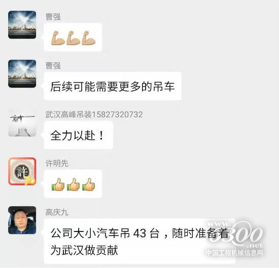 1月25日,徐工起重机械事业部武汉代表处主任曹强召集武汉周边起重机用户,成立“武汉徐工起重机应急保障微信群”,武汉吊装用户积极响应,纷纷报备车辆资源,随时候命,已集结10余台起重机,并按照中建三局要求主动报备车辆台数和位置,随时应战。