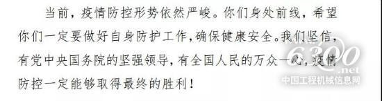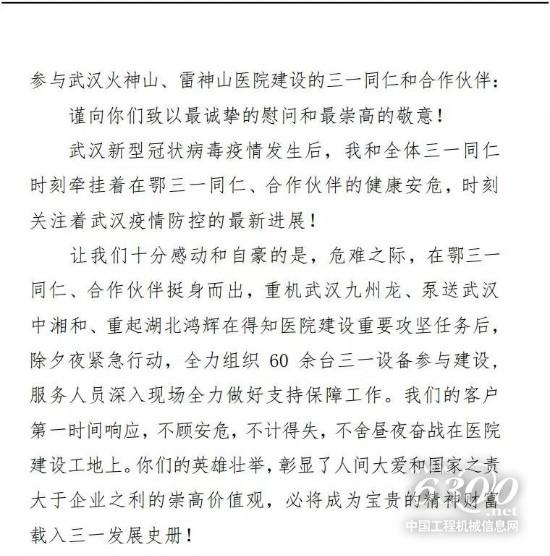 1月28日,三一集团董事长梁稳根致信参与武汉火神山、雷神山医院建设的三一同仁和合作伙伴,向他们表示诚挚慰问和崇高敬意。