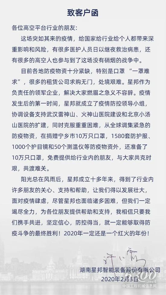 2月3日下午17点,湖南星邦智能装备股份有限公司(以下简称星邦)发起了为全国高空作业人免费赠送口罩的活动(首批10万只),活动一经发起,就得到了行业的广泛关注。