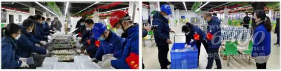 与厂房火热的生产画面遥相呼应的是员工食堂里那一个个忙碌的身影。因为山河智能食堂此前是员工自助就餐,从安全角度出发,复工后将采取分散就餐,由此造成了食堂人手严重不足,也造就了一道志愿者风景。在二十几位志愿者的帮助下,千余份盒饭,在工人中午下班分装完毕,等待各部门派来的代表前来领取。