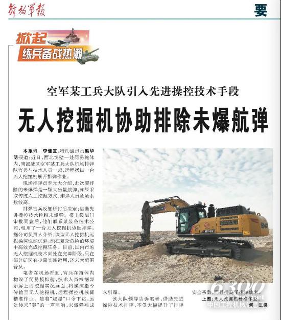 近期,《解放军报》报道了此事。文章称,“空军某工兵大队引入先进操控技术手段,无人挖掘机协助排除未爆航弹”,在业界引发关注。