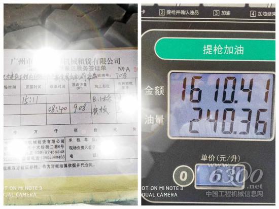 某客户使用V7大米数泵车,打料908方,用油240升,综合油耗0.26L/立方左右。