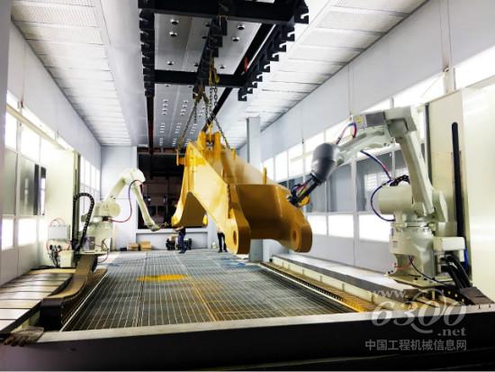 此外,挖掘机动臂斗杆喷涂自动生产线、装载机铲斗焊接自动生产线上,各种机器人系统正在各条生产线上有序运转。在相同产能下,每班人员仅需2人,人员减少12人,场地减少一半,物料流转次数减少3倍。