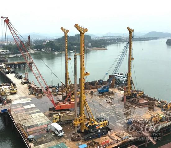 五台徐工XR550D旋挖钻机气势恢宏,屹立在广州南沙港铁路西江特大桥施工现场,助力主桥墩桩基工程。西江特大桥主桥采用钢箱混合双主梁等高塔斜拉桥,主跨600米,全桥长1118.7米,居同类铁路斜拉桥跨度世界第一