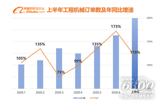 作为全球最大的B2B跨境电商平台,阿里巴巴国际站依托沉淀21年的大数据、数字技术,和一站式跨境供应链服务体系,打造数字化新外贸。疫情之下,数字化新外贸持续逆势高速增长。今年上半年,阿里巴巴国际站交易额同比增长80%,订单数同比增长98%,支付买家数同比增长60%。工程机械产品是中国外贸出口的第一大品类,同时也是阿里巴巴国际站的第一大行业。上半年,工程机械类产品在国际站的订单数月均增速达119%,6月份增速升至175%。