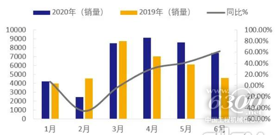 据中国工程机械工业协会统计,2020年6月工程起重机四类起重机产品共销售7380台,同比2019年增加2800台,增长61%,表现堪比挖掘机市场。2020年1-6月起重机四类产品累计销量超4万台,与2019年同期相比增长13.5%。其中国内市场销售38261台,同比增长14%左右。传统淡季叠加疫情影响,2020年一季度起重机销量略有下滑,二季度开始回暖,增速快速回升(41.7%),4月份销量为上半年月度最高。具体到机型,汽车起重机销量增幅最大,略高于行业平均水平,而轮胎起重机销量呈负增长。